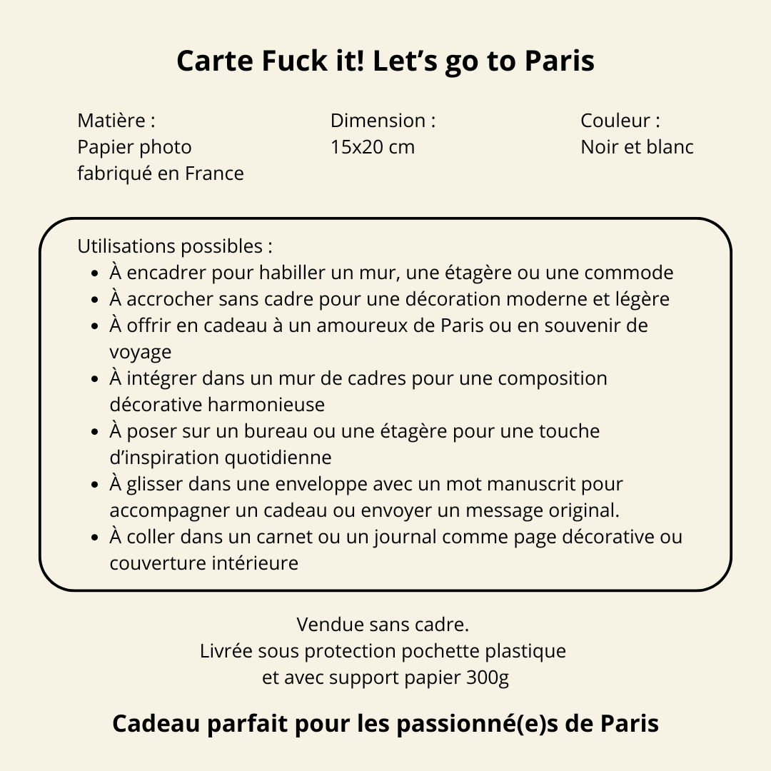 Apportez une touche parisienne à votre intérieur avec cette carte imprimée au format 15×20 cm, qui s’intègrera facilement dans tous les styles de décoration, du plus classique au plus contemporain.