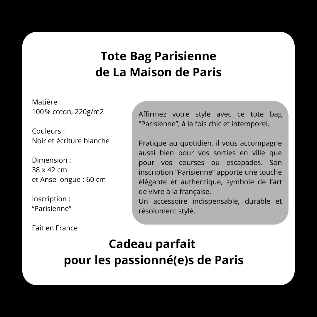 Affirmez votre style avec ce tote bag “Parisienne”, à la fois chic et intemporel.